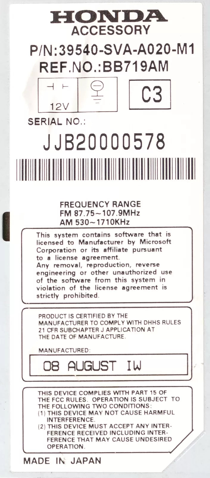 Compatible Part Number: 39540-SVA-A030-M1, 39540-SVA-315