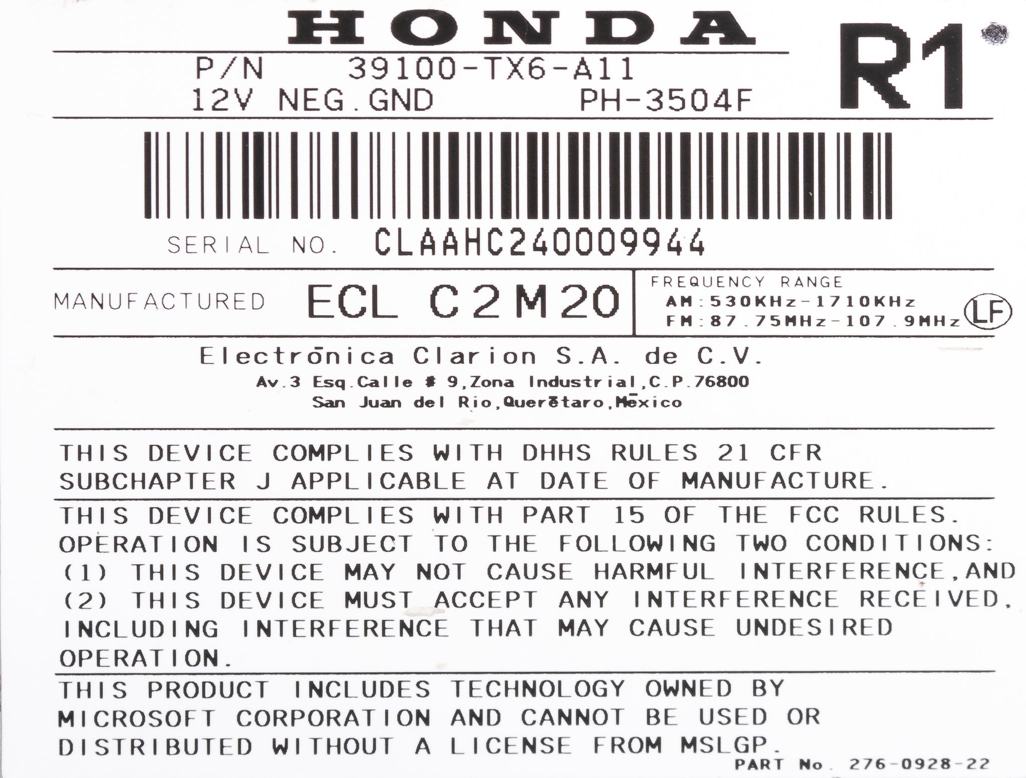 Compatible Part Number: 39100TX6A11, 39170TX6A11, 39171TX6A11