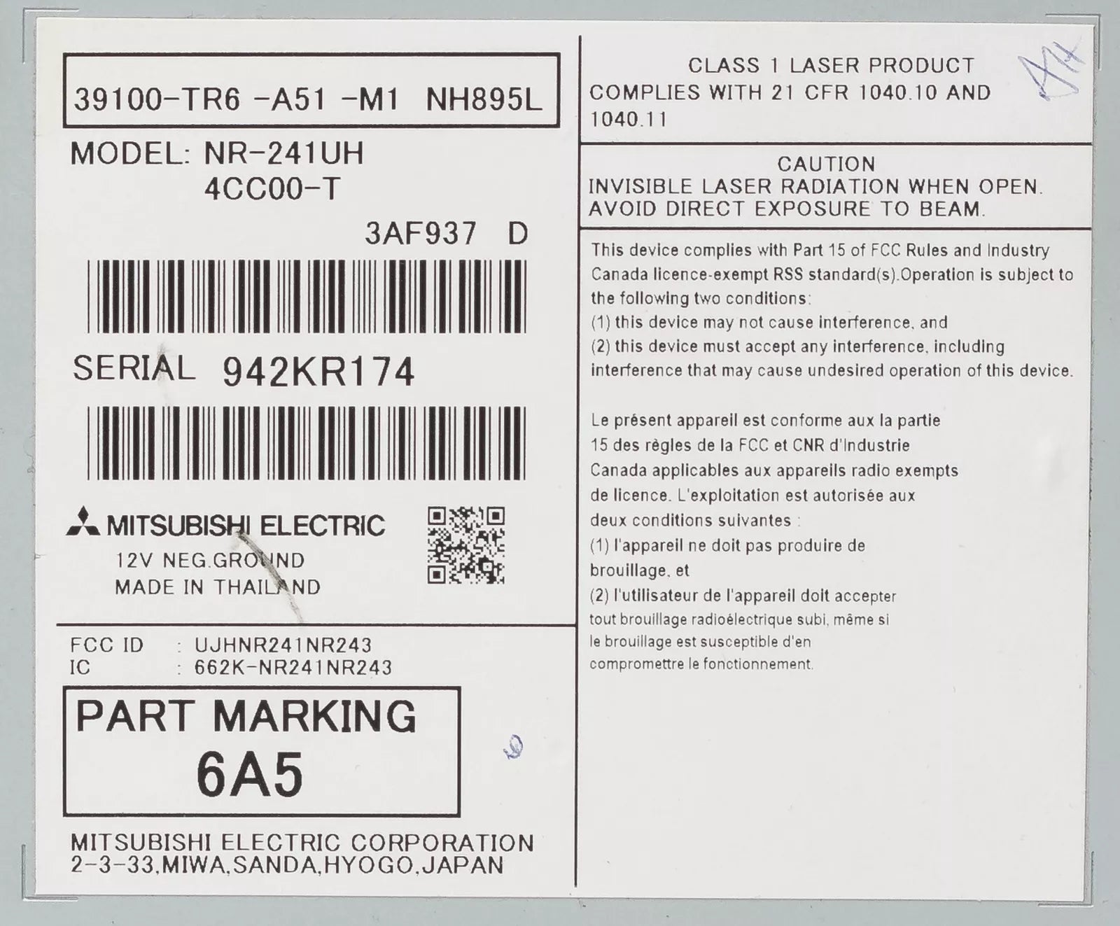Part Number: 39100-TR6-A51-M1