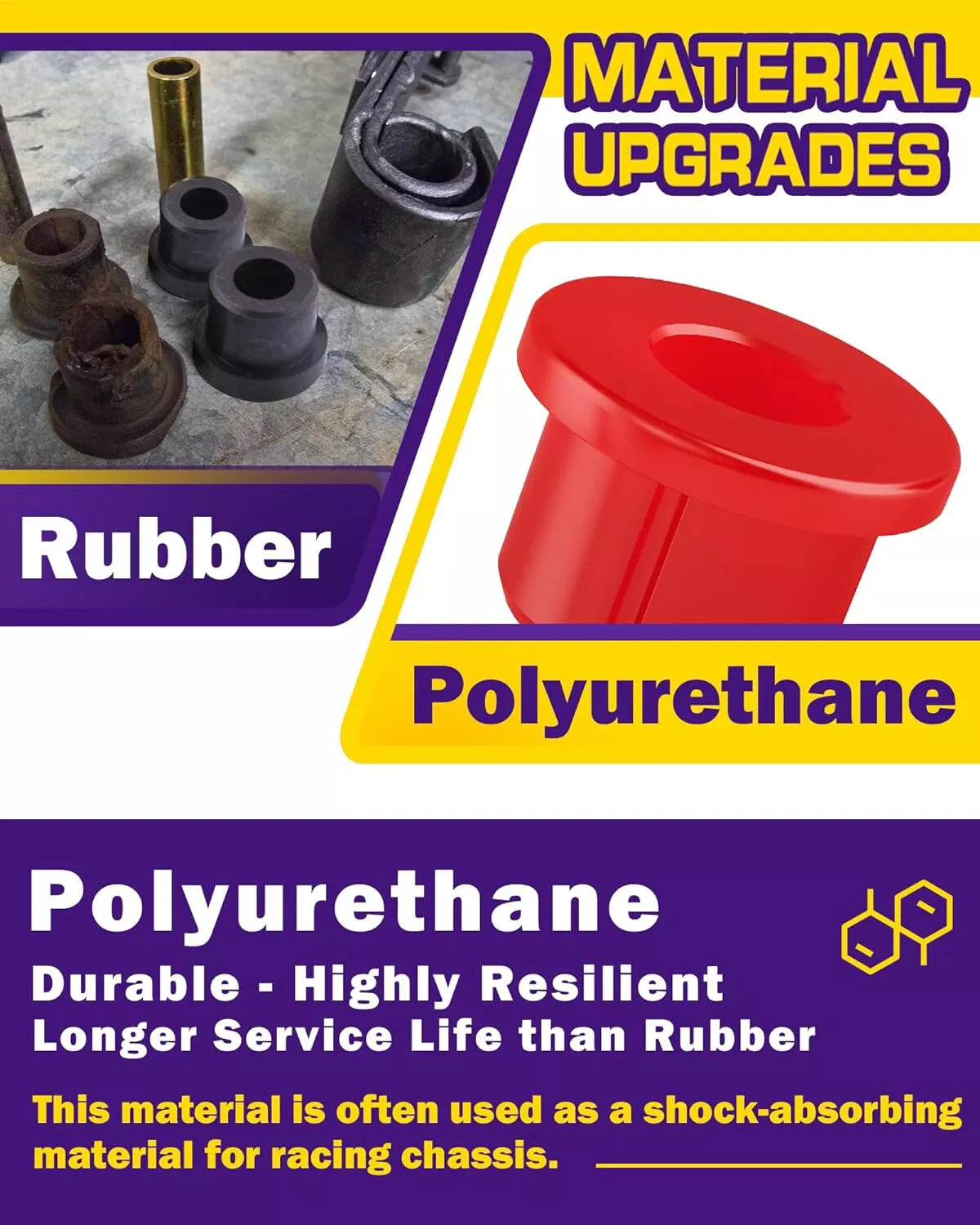 - Function - This bushing kit will act as a buffer for your lower leaf springs & upper A-Arm, and prevent metal-to-metal contact between the springs and shackles. Providing you better driving experience. Equipped with grease to assist you in installing the product and will extend the life of the product