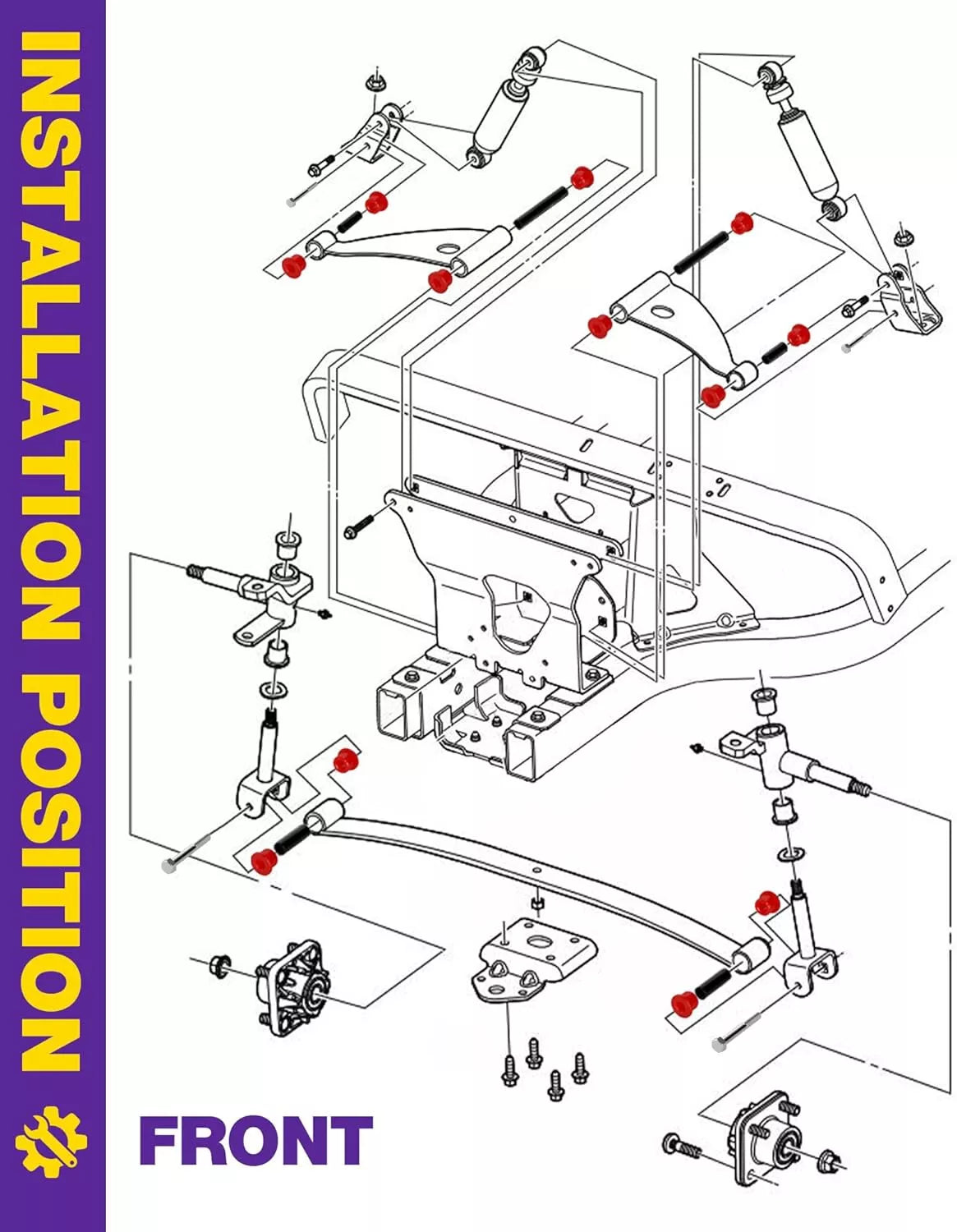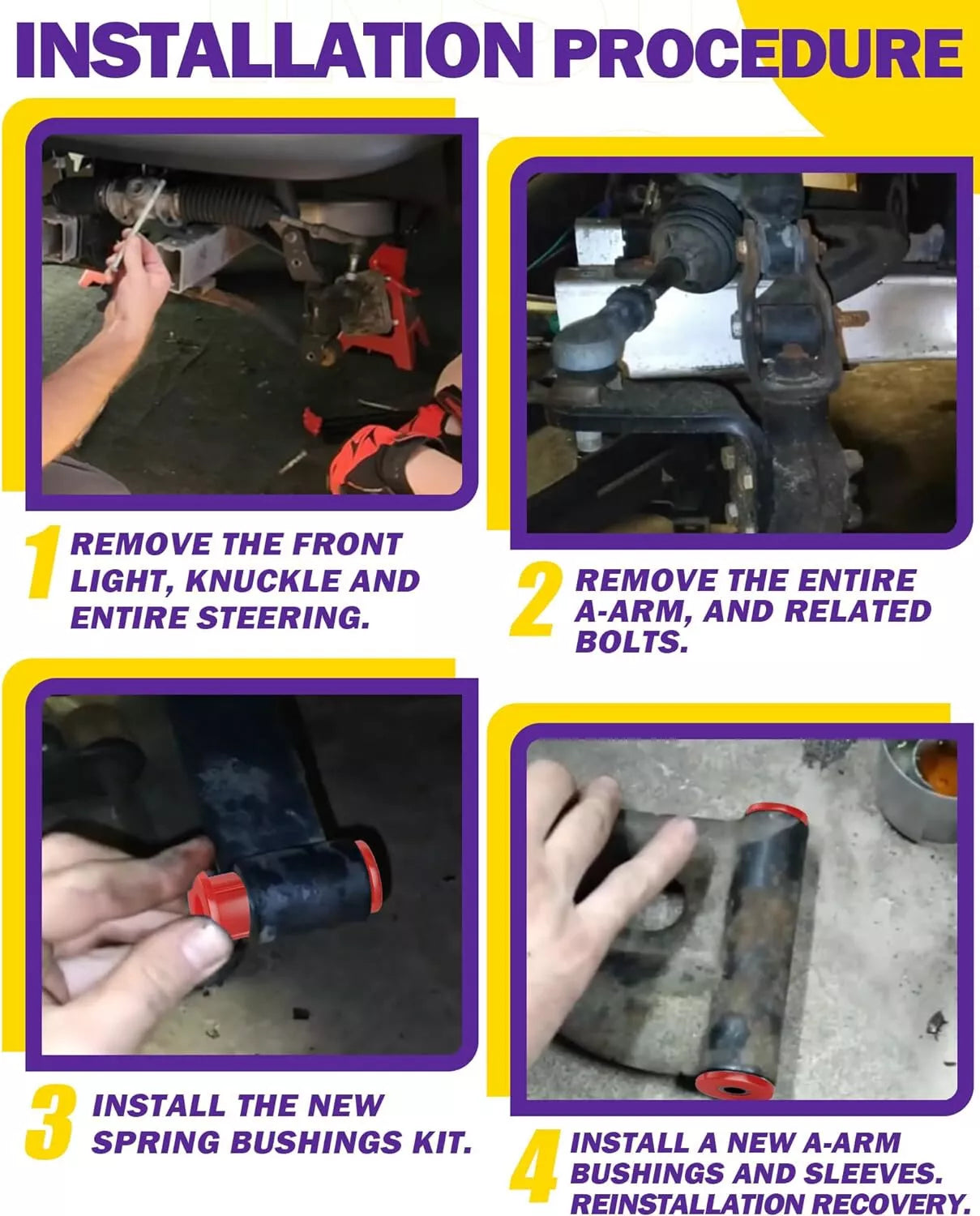 - Specification - Include front lower leaf spring bushings (4Pcs) & front upper A-Arm bushings (8Pcs), front lower leaf spring sleeves (2Pcs) & front upper A-Arm sleeves(2Pcs inner sleeves & 2Pcs outer sleeves), 6Pcs screws, 2Pcs special grease and installation instructions.